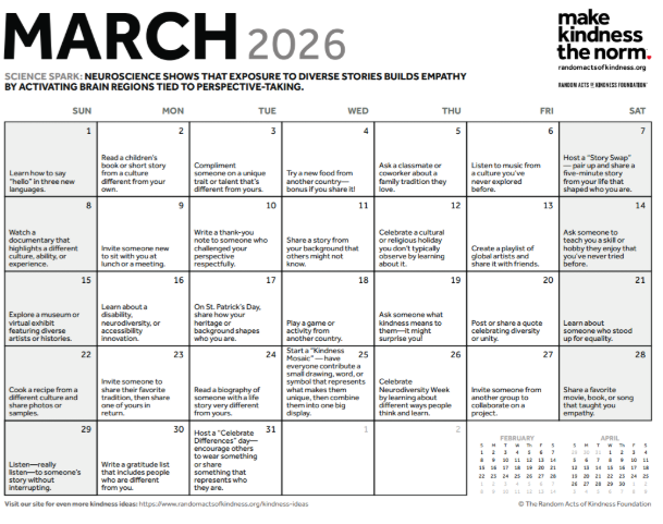 The Random Acts of Kindness Foundation website has monthly kindness calendars to make spreading kindness even easier!